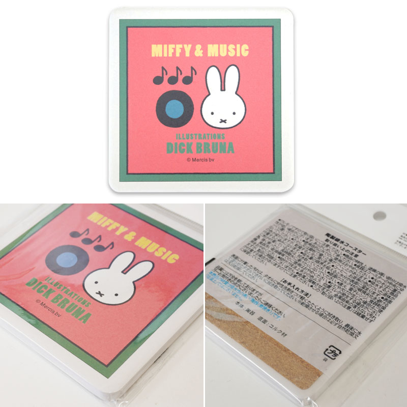 綺麗なピンクにミッフィーとレコードと音符のイラストがかわいい角型コースター。給水性の高い素材でコップの水滴をしっかり吸い取ってくれます。裏面はテーブルを傷つけにくいコルク仕様で◎