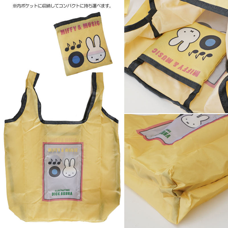 お買い物に便利なエコバッグ。ミッフィーのお顔と音符とレコードのイラストを組み合わせて可愛くデザインしました。内ポケット付きでポケットに本体を収納できる嬉しい仕様。小さく折り畳んでコンパクトに持ち運べるので旅先などでも活躍してくれそうです。バッグに常備したいアイテムですね。