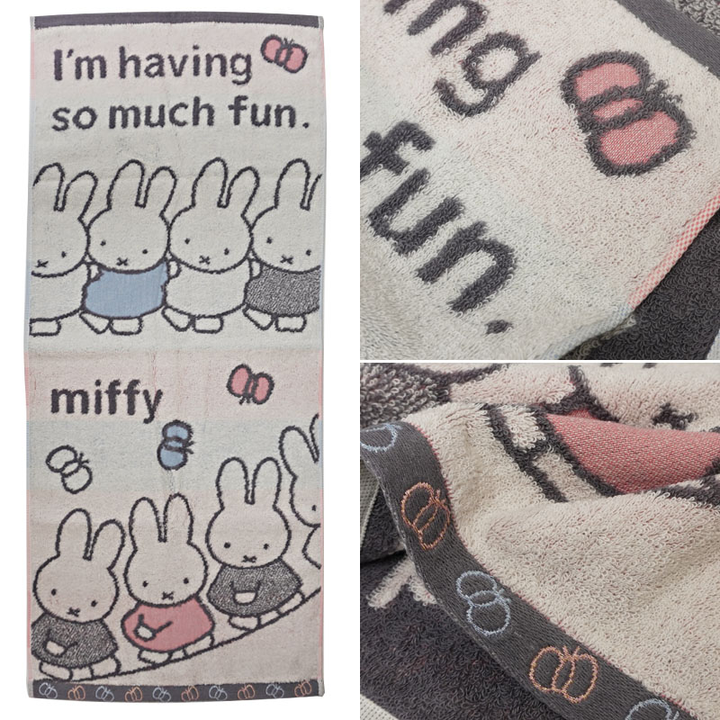 ミッフィー達が列を作ったオシャレなフェイスタオルです。肌触りも良く、タオル掛けに掛けてあるだけでインテリアになるタオルです。