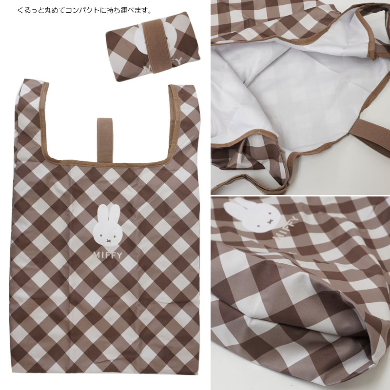 お買い物に便利なエコバッグ。若干小ぶりのサイズでコンビニのちょっとしたお買い物用に便利そうです。斜めに構成・デザインされた格子柄のダイアゴナルチェックとミッフィーフェイスの組み合わせが可愛いデザイン。小さく丸めてコンパクトに持ち運べるので旅先などでも活躍してくれそうです。バッグに常備したいアイテムですね。