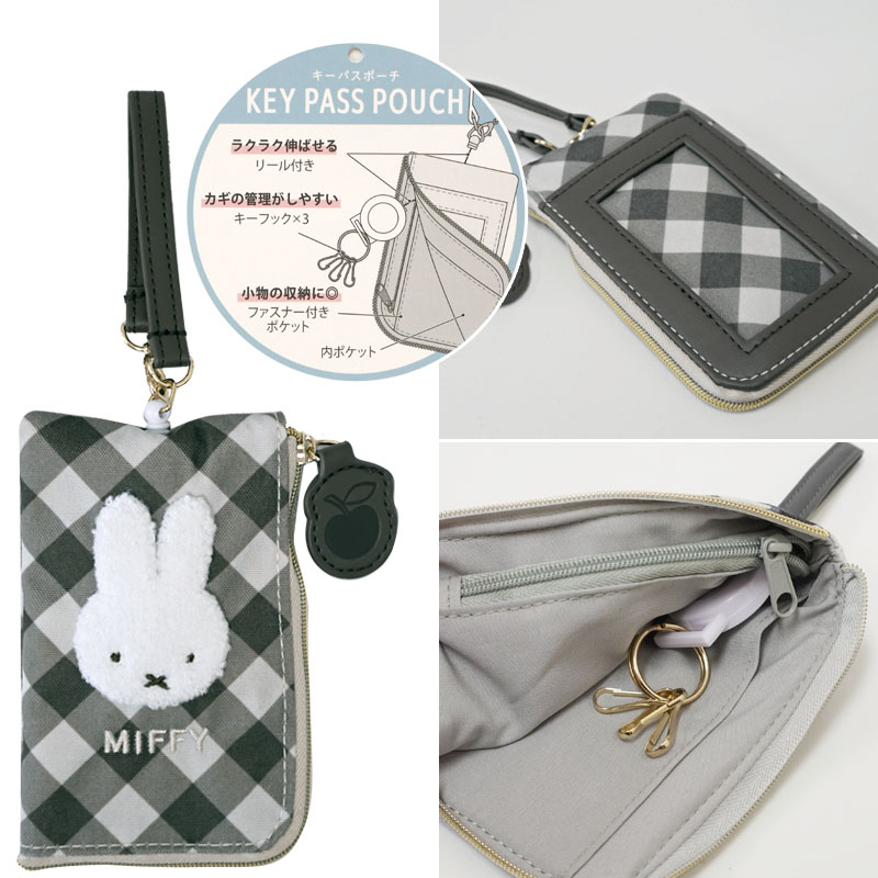 斜めに構成・デザインされた格子柄のダイアゴナルチェックとミッフィーフェイスの組み合わせがオシャレなパスケース。ファスナーを開けてカードやコインなど、小物も入れられて、便利なパスケースです。コードリール仕様なのでバッグなどに取り付けたまま長く伸ばして使うことができます。色使いも落ち着いててとても使いやすいアイテムです。
