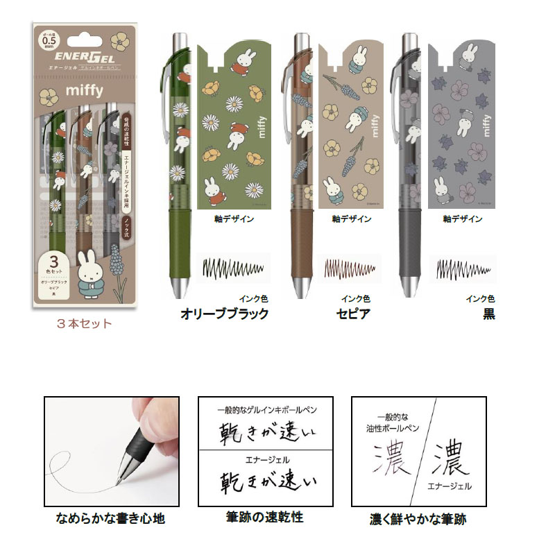 ミッフィー×「エナージェル」コラボがレトロで大人っぽいビンテージカラーで3色セットで登場しました。速乾性の滑らかな書き心地が嬉しいです。