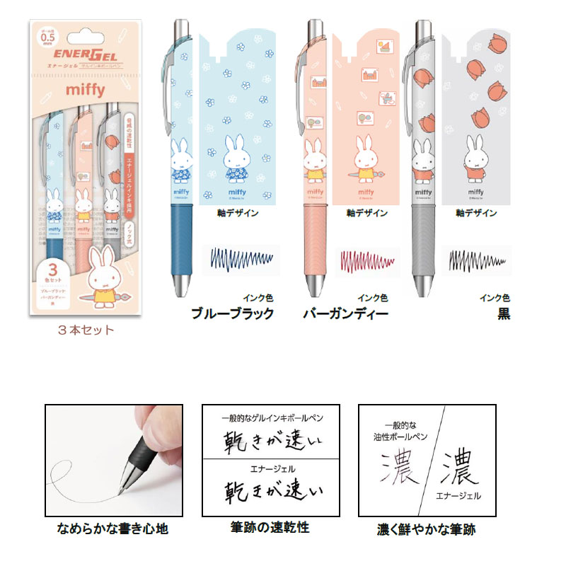 「スッと書けて、サッと乾く!」で有名な「ぺんてる」の「エナージェル」のミッフィー商品です。