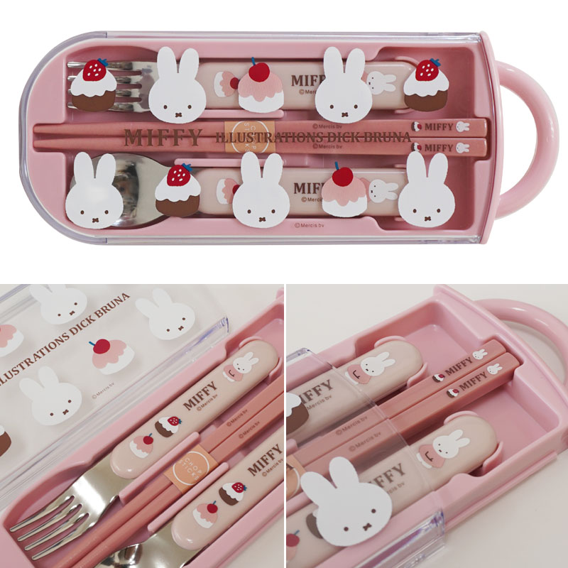 箸、フォーク、スプーンがセットになったトリオセット。シンプルにミッフィーとケーキのイラストがとても可愛いです。ハンドル付きなので、小さなお子さんでもスライドしやすく出し入れが簡単。ランチボックスと合わせて使いたいアイテムですね。