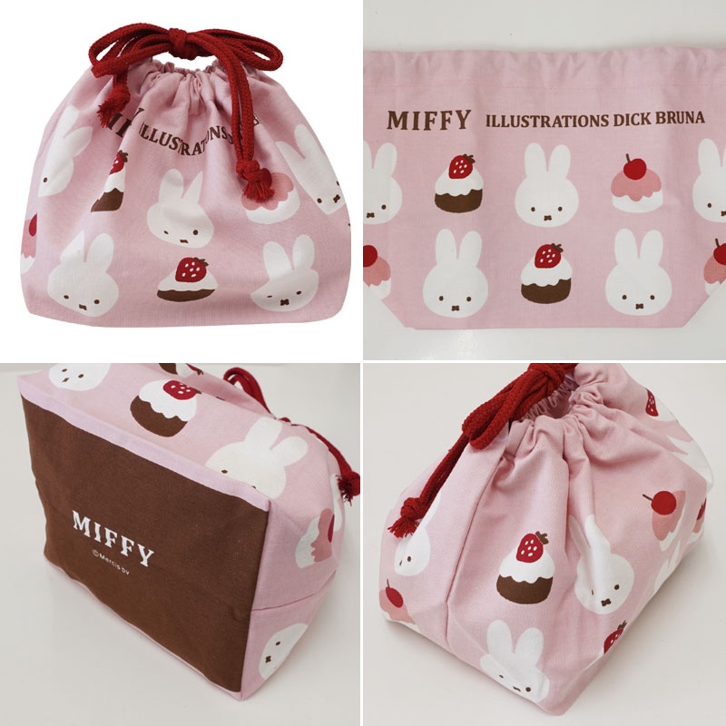 シンプルにミッフィーとケーキのイラストで上品に仕上げられたランチ巾着。ランチボックスとお揃いで使いたくなりますね。