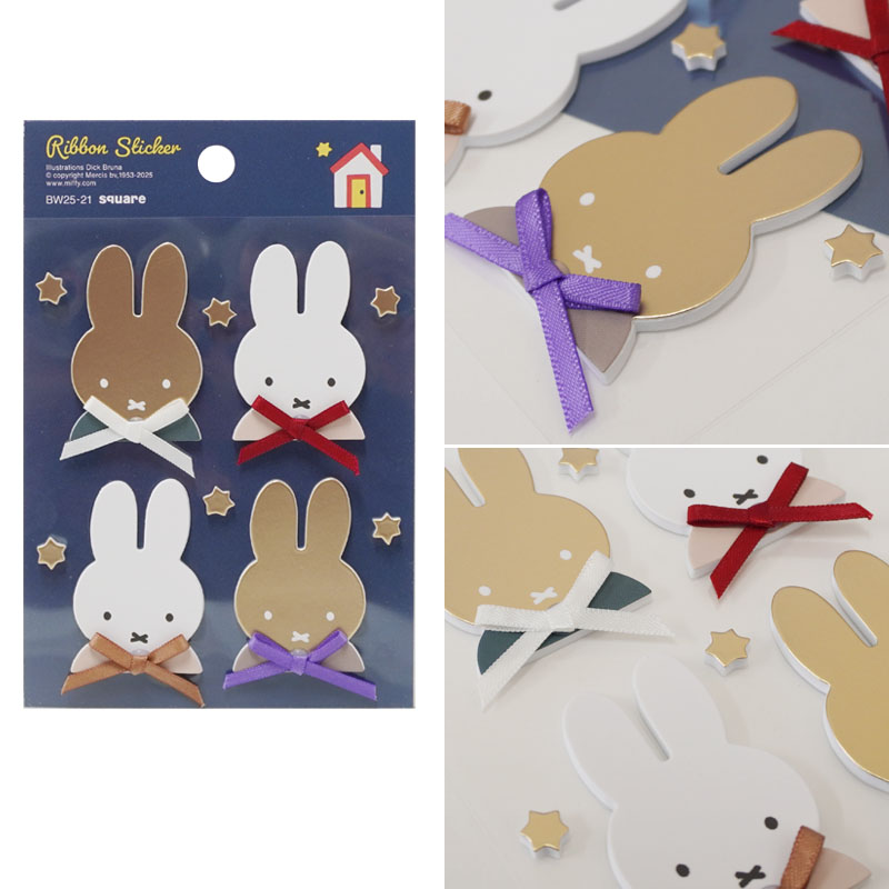 立体的なリボンパーツと金箔が可愛いミッフィーのダイカットシール4個と星型シール6個のセット。手紙の封かんや、ラッピングなど、様々な用途に活用できます。
