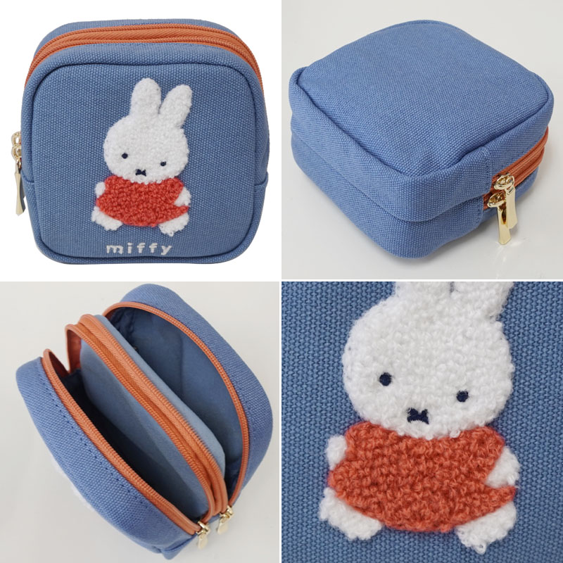 落ち着いたブルーが目を惹くWファスナーポーチ。ミッフィーをサガラ刺繍で表現し、お洒落に仕上げられています。それぞれに独立した2箇所に収納可能な便利なポーチです。