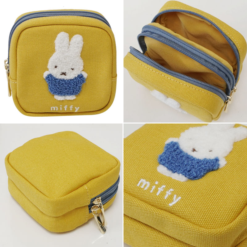 落ち着いたイエローが目を惹くWファスナーポーチ。ミッフィーをサガラ刺繍で表現し、お洒落に仕上げられています。それぞれに独立した2箇所に収納可能な便利なポーチです。