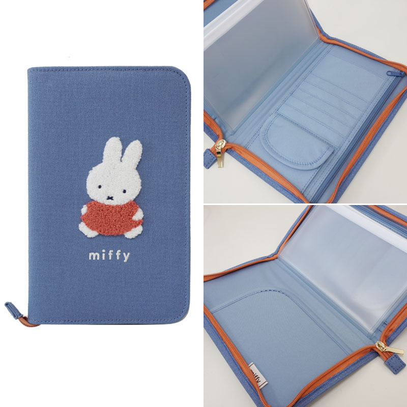 落ち着いたブルー地にミッフィーがサガラ刺繍でデザインされた多機能のマルチポーチ。母子手帳や通帳、マスクなど大切な物をスマートに保管し持ち運びできる、便利なポーチです。
