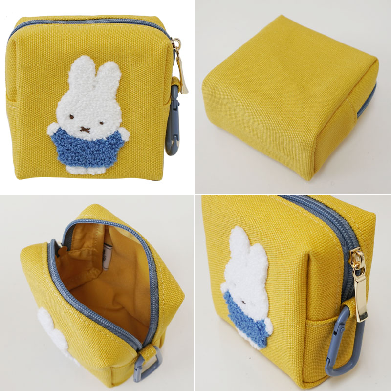 落ち着いたイエロー地にミッフィーがサガラ刺繍でデザインされたミニポーチ。コロンとしたフォルムにも幅広のマチで小さいサイズながらもコスメや小物の収納に重宝しそう! 持ち運びに便利なカラビナ付きが嬉しいですね。