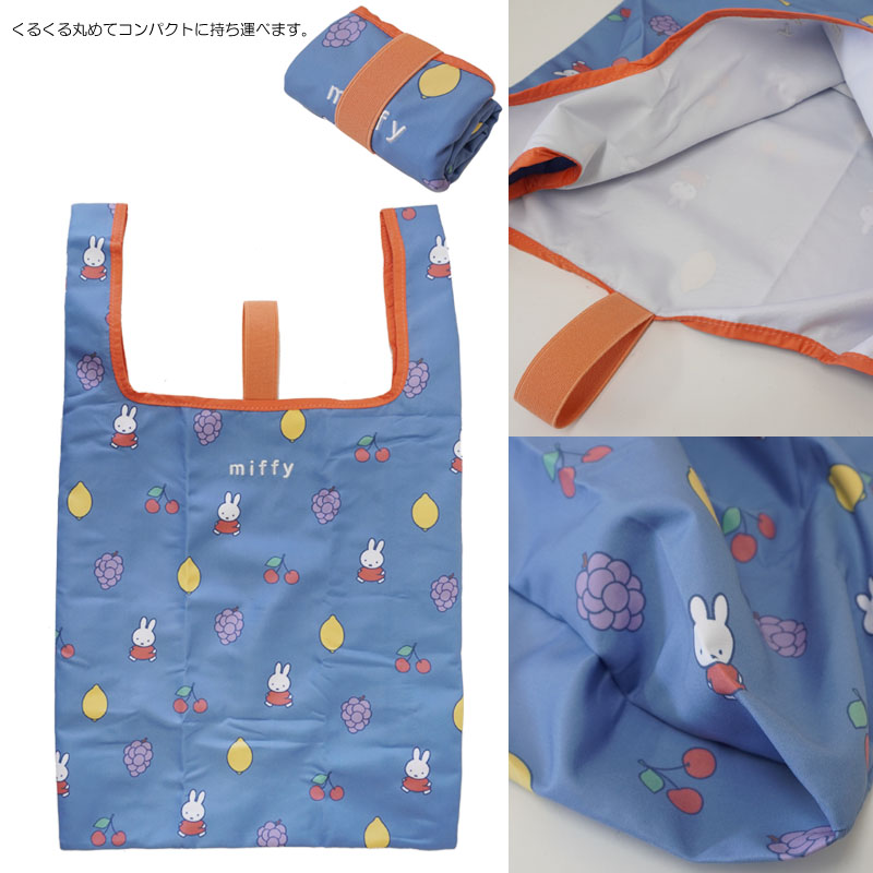 お買い物に便利なエコバッグ。若干小ぶりのサイズでコンビニのちょっとしたお買い物用に便利そうです。落ち着いたブルー地にミッフィーとフルーツが可愛いデザイン。小さく丸めてコンパクトに持ち運べるので旅先などでも活躍してくれそうです。バッグに常備したいアイテムですね。