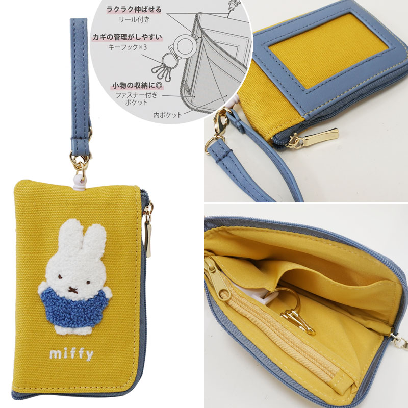 落ち着いたイエロー地にミッフィーがサガラ刺繍でデザインされたオシャレなパスケース。ファスナーを開けてカードやコインなど、小物も入れられて、便利なパスケースです。コードリール仕様なのでバッグなどに取り付けたまま長く伸ばして使うことができます。色使いも落ち着いててとても使いやすいアイテムです。