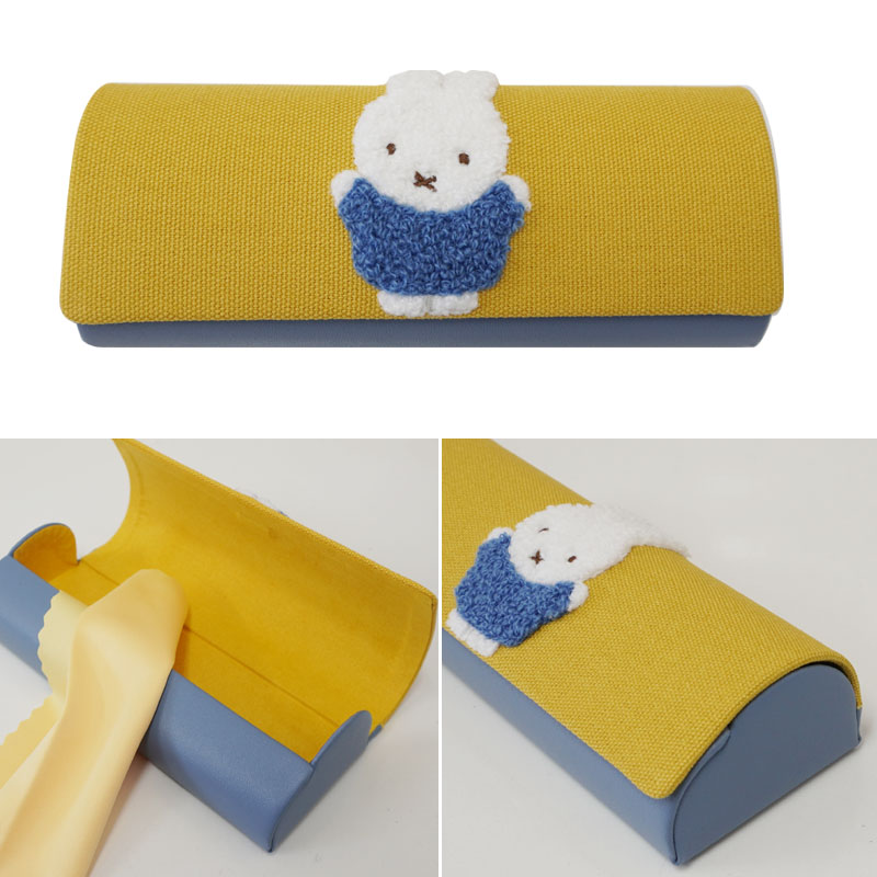 落ち着いたイエロー地にミッフィーがサガラ刺繍でデザインされたメガネケース。メガネはもちろん、サングラスの持ち運びに便利なアイテムです。
