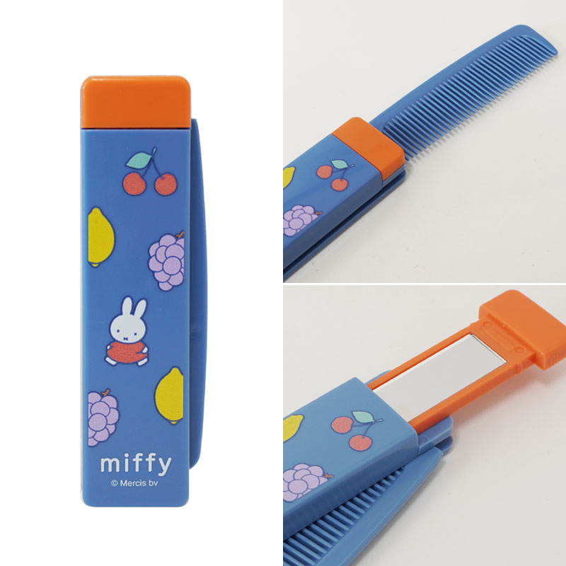 落ち着いたブルーにミッフィーとフルーツが可愛い折りたたみコーム。ミラーもセットされてていつでも持ち歩きたいアイテムです。