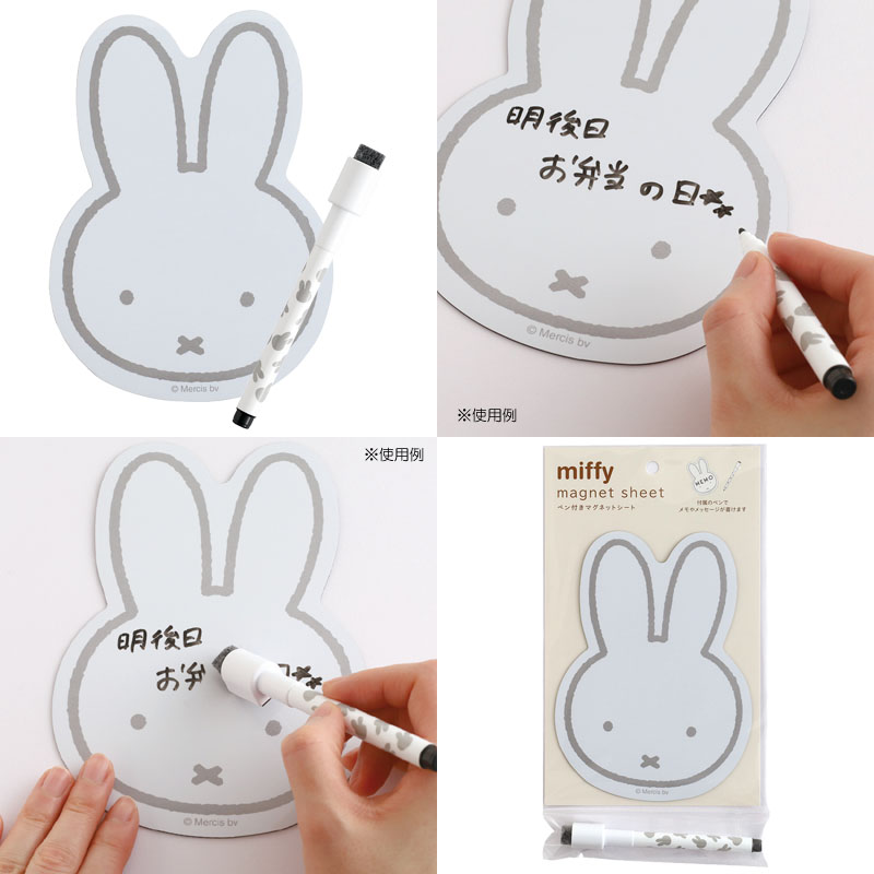 ミッフィーの顔型マグネットシートで冷蔵庫などの鉄製の壁に貼り付けて付属のペンでメッセージを書けるようになっています。