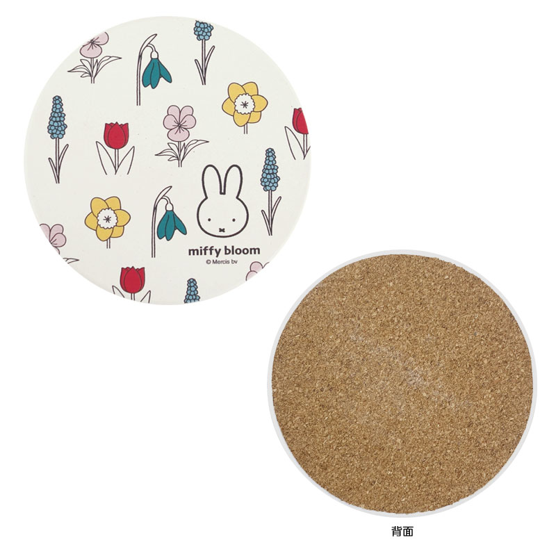 綺麗な白生地にミッフィーとお花のイラストで上品に仕上げられたコースター。給水性の高い素材でコップの水滴をしっかり吸い取ってくれます。裏面はテーブルを傷つけにくいコルク仕様で◎