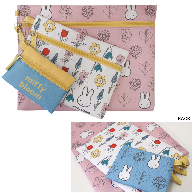 大、中、小と3つのタイプのポーチをセットしました。セットでも使えるし、留められているチェーンを外して別々でもOK。どれもフラットタイプで、筆記具やサニタリー系に、使い方いろいろ。ミッフィーとお花のイラストで上品に仕上げられました。