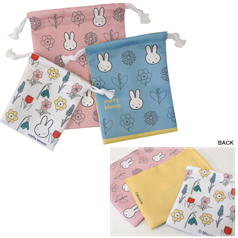 3サイズの巾着をセットしました。小物類の収納に嬉しいアイテムですね。ミッフィーとお花のイラストの組み合わせで表現されたデザインがとてもオシャレです☆
