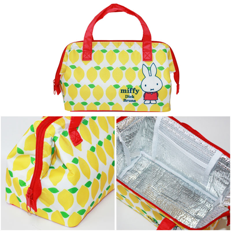 レモンのイラストがいっぱいの中、ミッフィーのイラストがとても可愛い保冷バッグ。ワイヤー入りの開閉口で中身が取り出しやすく、内側のアルミシートで簡易的な保冷・保温が可能です。ランチタイム、レジャーに様々なシーンで活躍してくれそうです。
