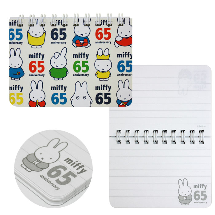 ミッフィー65周年のロゴでオシャレに表現したリングメモ。持ち運びに便利なサイズで、普段のメモ書き帳にオススメしたいアイテムです。