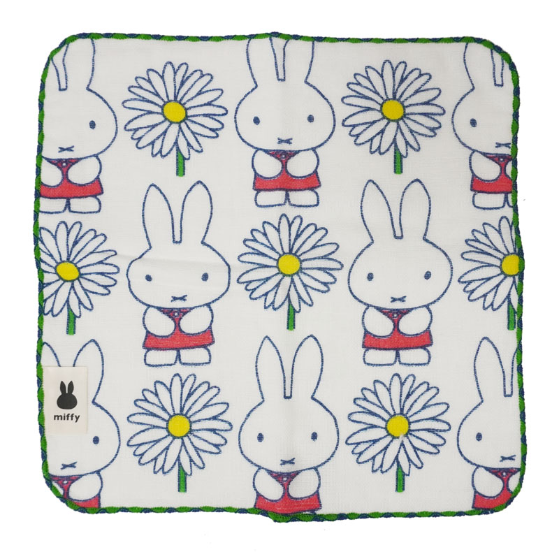 やさしい肌触りのガーゼとしっかり吸水のパイルを組み合わせたハンカチーフ。整列したとんがり耳のミッフィーとお花がオシャレですね。