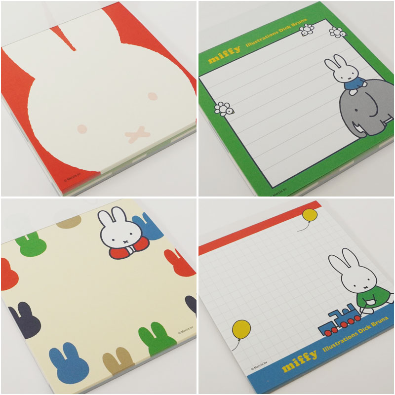 正方形の可愛いメモパッド。ミッフィーと様々なイラストを組み合わせてデザインしました。ちょっとしたメモやオフィスでの伝言など、あると便利なアイテム。かわいい4デザインのメモが入っているのも嬉しいですね。